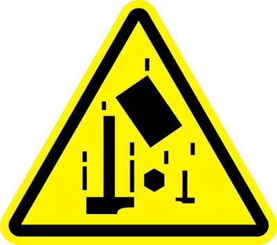 Наклейка или табличка "Осторожно, падающие предметы" применяется на опасных производствах. Возможно использования вместе со предписывающим знаком "Работать в защитной каске".